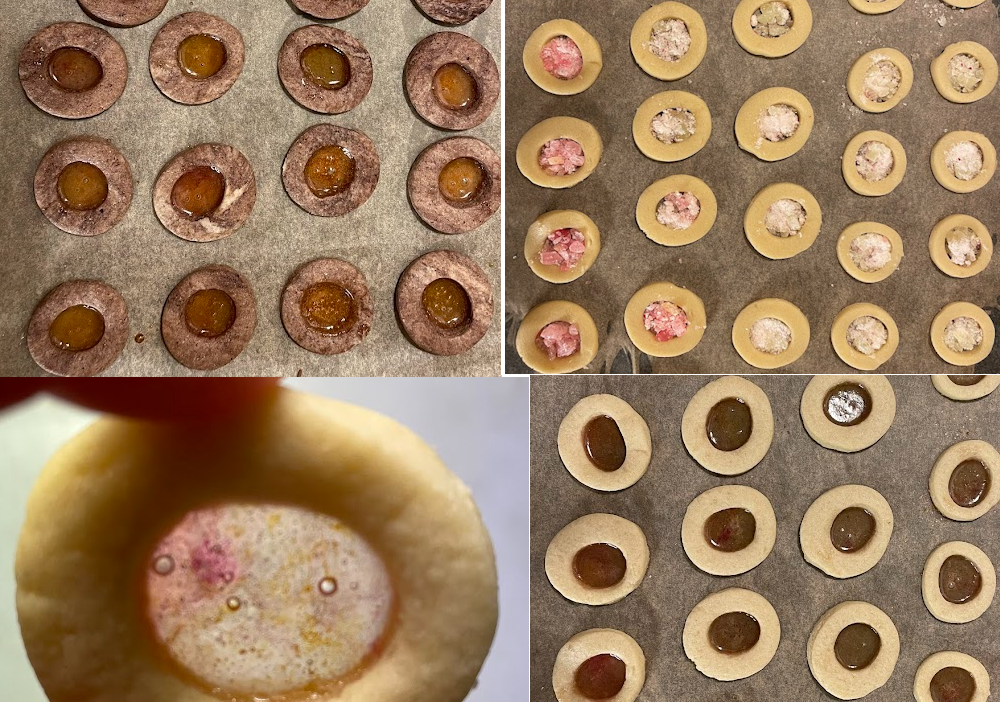 Umjesite smjesu za kekse – bilo koje kakve i inače radite – evo npr: 115g masla, 100g štauba, 1 kesica vanilije, 1 jaje, 250g brašna i prstohvat soli. Ja sam smjesu podijelila u dva dijela. Prvu polovicu sam razvaljala takvu a u drugu sam umijesila ožicu kakaa. Režete oblike keksa i svakom izdubite rupu. Posložite ih na papir za pečenje u velikom plehu.