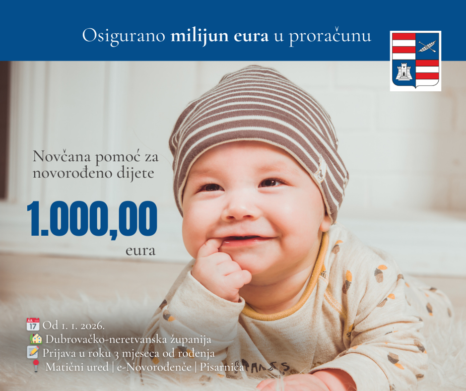 Čak milijun eura u novom proračunu Dubrovačko-neretvanske županije osigurano je za ovu mjeru, koja se odnosi na sve bebe rođene od 1. 1. 2026. godine, a čije obitelji pravovremeno podnesu zahtjev i ispunjavaju propisane uvjete.