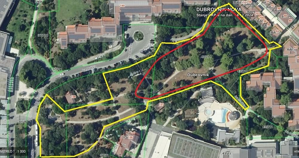 Riječ je o predmetu Županijskog suda u Dubrovniku, br. Gž-712/22. Grad Dubrovnik je prilici da ishodi pravo vlasništva dijela (približno označeno crvenim) centralnog parka na Babinom Kuku (žuto na skici), pa držimo da valja pričekati pravomoćnu presudu (bez rasprave o tome na Gradskom vijeću).