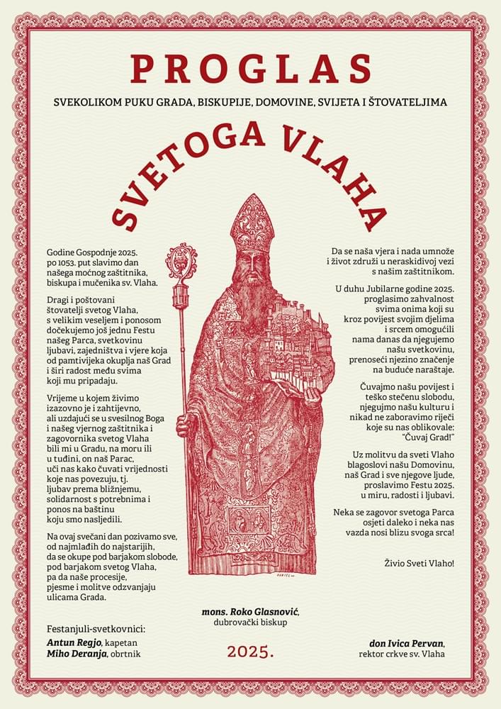 Objavljeni su Proglas i Crkveni program Feste sv. Vlaha 2025. kojima se štovatelji sv. Vlaha pozivaju na njegovu Festu i upoznaju s predvoditeljima njezinih dijelova uz podsjećanje na tradicionalni tijek Feste.