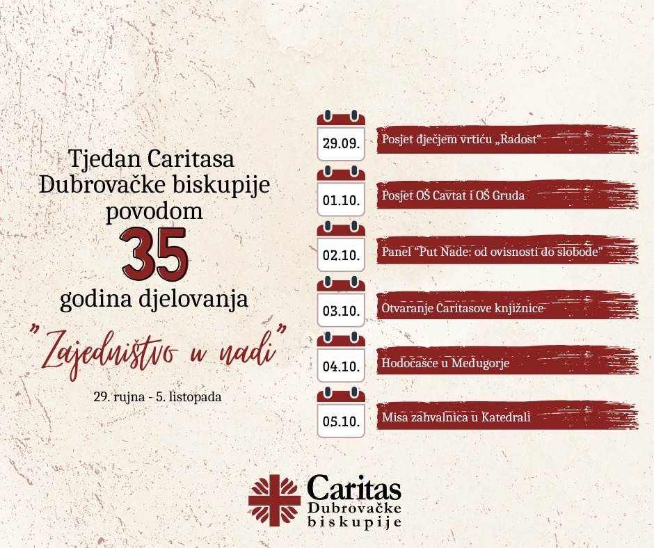 Povodom 35 godina institucionalnog djelovanja pod geslom „Zajedništvo u nadi“, Caritas Dubrovačke biskupije organizira niz događanja u Tjednu Caritasa koji će se održati od 29. rujna do 5. listopada.