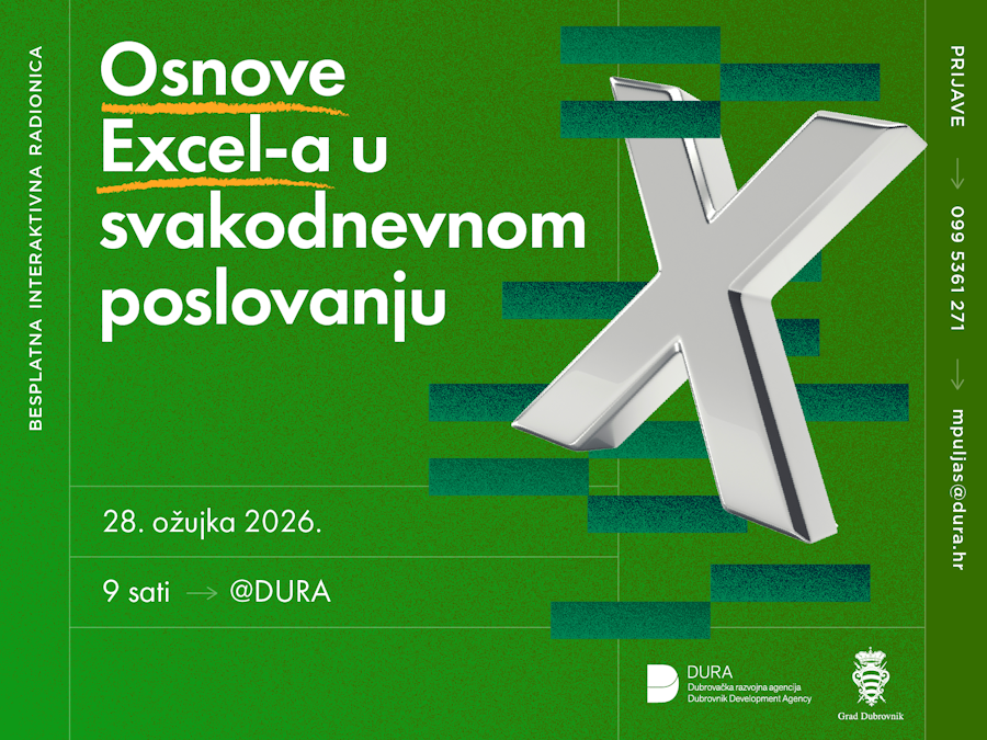 Excel je nezaobilazan alat u svakodnevnom poslovanju, koristi se u brojne svrhe, od upravljanja proračunima, poslovnog planiranja, analize prodaje, sve do praćenja podataka o klijentima i mnogih drugih poslovnih procesa. U okviru Startup akademije za vas smo organizirali radionicu „Osnove Excela u svakodnevnom poslovanju“ koja će se održati 28. ožujka 2026. u prostorijama DURA-e (Branitelja Dubrovnika 15, 20000 Dubrovnik) s početkom u 9h.