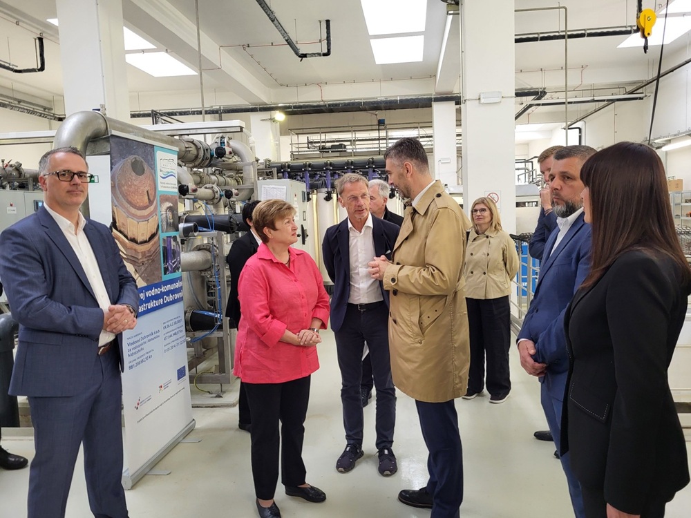Direktorica Međunarodnog monetarnog fonda Kristalina Georgieva, u pratnji gradonačelnika Dubrovnika Mata Frankovića, sa suradnicima, te guvernera HNB-a Borisa Vujčića posjetila je danas postrojenje pročistača za vodu u Komolcu, koji je prvi takav pročistač izgrađen u Republici Hrvatskoj, financiran europskim sredstvima. Gradonačelnik Franković upoznao je direktoricu MMF-a s benefitima ovog projekta koji je osigurao građanima Dubrovnika čistu i pitku vodu 365 dana u godini, kao i s rezultatima drugih projekata izvedenih u sklopu Aglomeracije, poput povijesnog čišćenja kanalizacije u povijesnoj jezgri. Kristalina Georgieva istaknula je kako je impresionira viđenim, kvalitetom gradnje i samim funkcioniranjem uređaja.