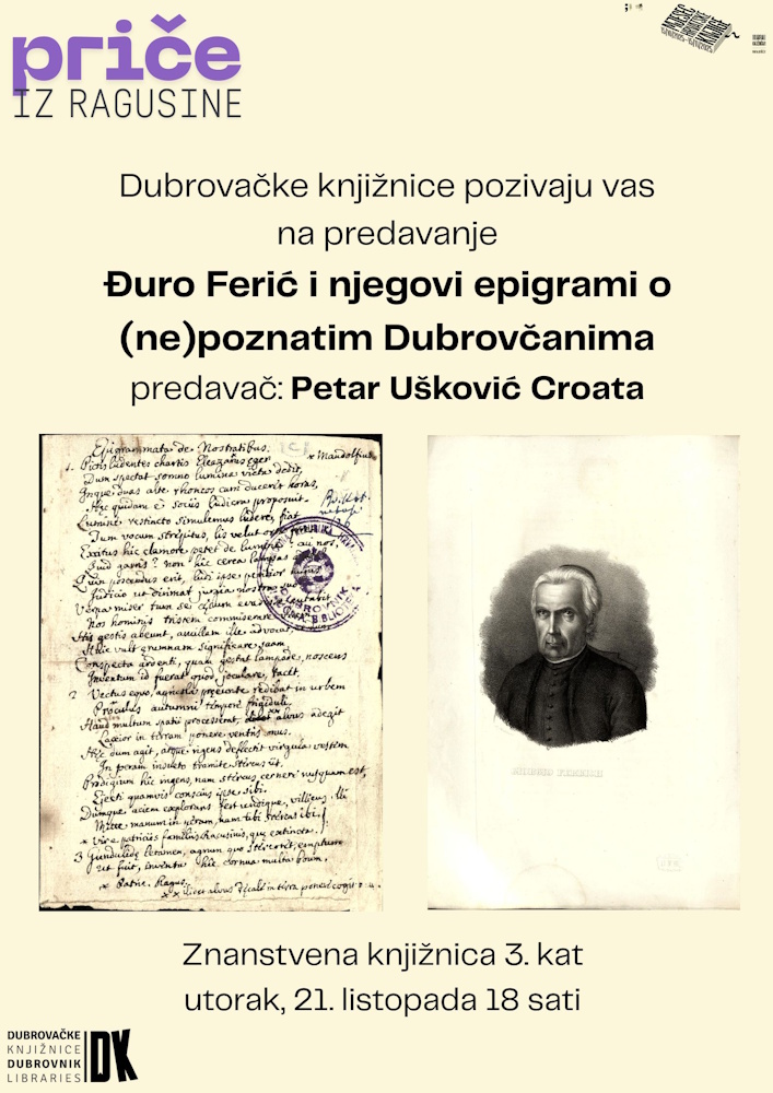 U sklopu programa Mjeseca hrvatske knjige Dubrovačke knjižnice organiziraju predavanje “Đuro Ferić i njegovi epigrami o (ne)poznatim Dubrovčanima” dr. sc. Petra Uškovića Croate. Događanje će se održati na trećem katu Znanstvene knjižnice, u utorak, 21. listopada 2025. s početkom u 18 sati.