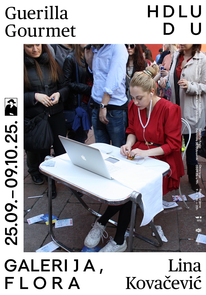 U umjetničkom se kontekstu gerilske akcije vežu uz street art i performans. Gerilski performansi i umjetnički radovi često imaju i estetske karakteristike ad hoc pripreme i brze ulične izvedbe kojoj slijedi – bijeg. Kod umjetnice i dizajnerice Line Kovačević forma pobune je spekulativni dizajn, a akcije koje izvodi u javnom prostoru upotpunjene su objektima – elaboriranim predmetima želje koje je osmislila za tu svrhu, potpuno se odmičući od gerilske estetike. No još je zanimljiviji očekivani rezultat pobune – a to je ostvarivanje bliskosti. Naziv izložbe “Guerilla Gourmet” se tako odnosi na seriju performansa koje izvodi u kontekstu javnog prostora ili prostora u privatnom vlasništvu, ali otvorenog javnosti, a koji se veže uz njen raniji rad “Set za online romantičnu večeru”.