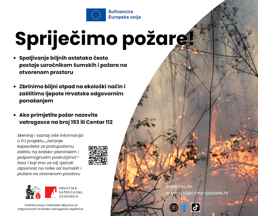 „Nekontrolirano spaljivanje korova čest je uzročnik šumskih požara, a kako bi se poboljšala zaštita od tih rizika, Hrvatska vatrogasna zajednica provodi EU projekt „Jačanje kapaciteta za protupožarnu zaštitu na brdsko-planinskim i potpomognutim područjima“. Ovaj projekt ima za cilj unaprijediti otpornost tih područja na požare, nabaviti vozila i opremu za gašenje požara te educirati građane o prevenciji“, rekao je glavni vatrogasni zapovjednik Slavko Tucaković i dodao kako projekt traje do 2027. godine, a obuhvatit će sve vatrogasne postrojbe koje djeluju na ugroženim područjima.