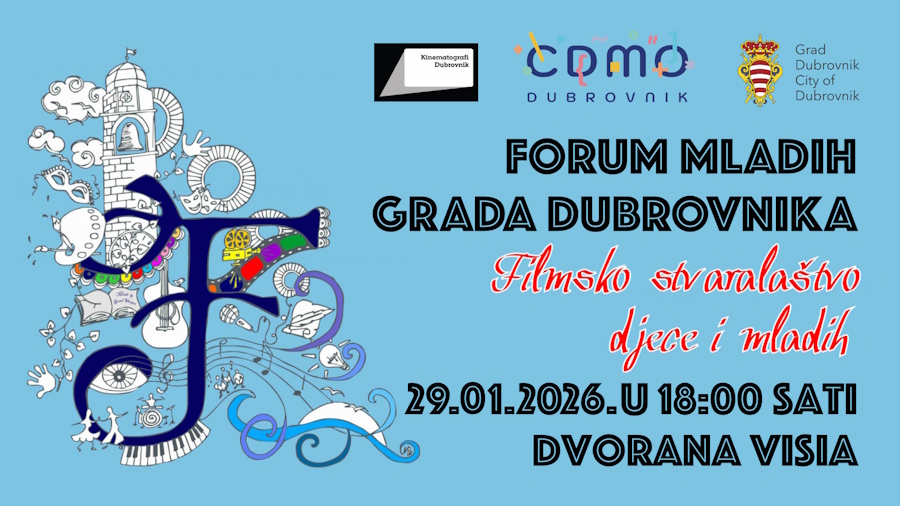 Cjelogodišnja manifestacija Forum mladih Grada Dubrovnika nastavlja se sutra, 29. siječnja uz “Filmsko stvaralaštvo djece i mladih” s početkom od 18h u dvorani Visia. Organizator je Centar za djecu, mlade i obitelj Dubrovnik u ime UO za obrazovanje, šport, socijalnu skrb i civilno društvo Grada Dubrovnik uz potporu Kinematografa Dubrovnik.
