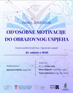Panel-diskusija: od osobne motivacije do obrazovnog utjecaja dio je projekta rada s darovitim i visokomotiviranim učenicima Gimnazije Dubrovnik – STEMspiracija: znanje kao zvanje, koji se provodi pod pokroviteljstvom Ministarstava znanosti i obrazovanja. Panel-diskusija održat će se u suradnji s Dubrovačkim knjižnicama, u ogranku Lapad. 24. 2. u 19:00