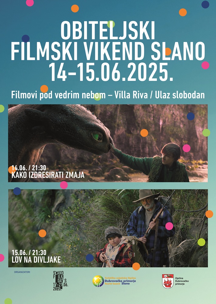 Ove je godine filmski program proširen, pa nas 14. i 15. lipnja očekuje Obiteljski filmski vikend ususret SFD-u. Projekcije će se također održavati u vrtu Vile Riva, a prikazivat će se filmovi LOV NA DIVLJAKE redatelja Taike Waititija i KAKO IZDRESIRATI ZMAJA, koji je režirao Dean DeBlois, a koji se u kinima počinje prikazivati u isto vrijeme.
