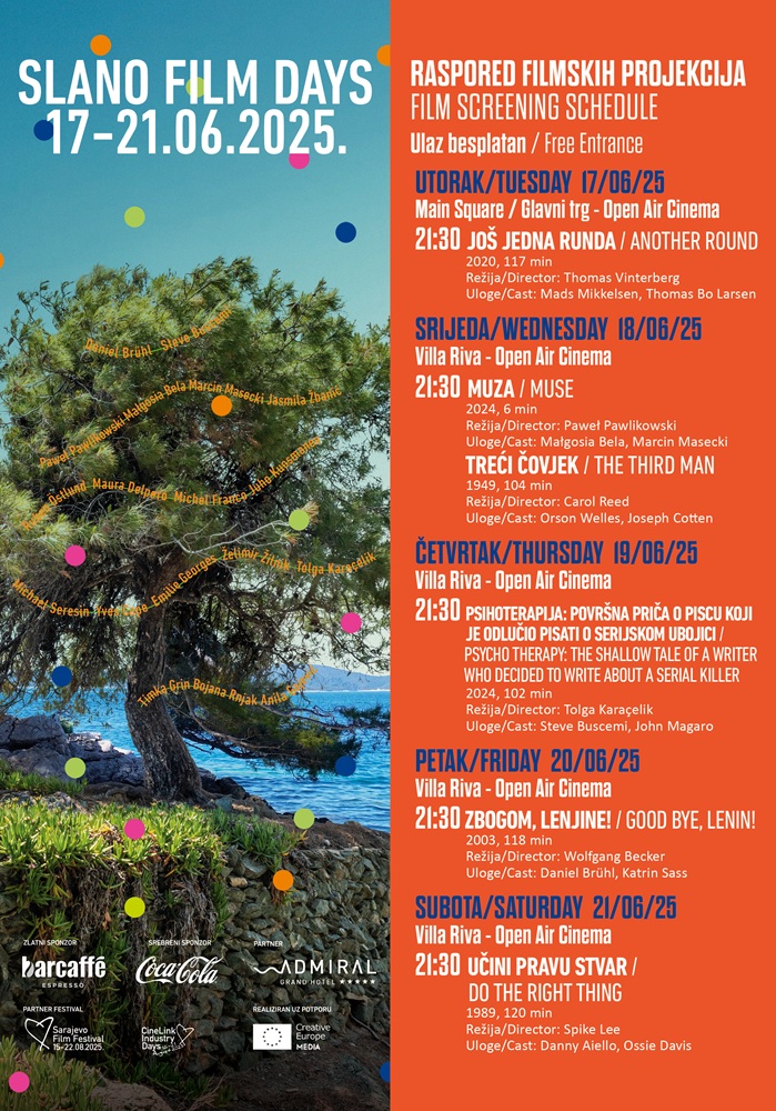 Sve ljubitelje filmske umjetnosti i ove godine očekuju besplatne projekcije u vrtu Vile Riva. Prvu večer, 17. lipnja, prikazivat će se Oscarom nagrađen film JOŠ JEDNA RUNDA Thomasa Vinterberga. 18. lipnja očekuju nas dvije filmske projekcije. Prva je kratkometražni film MUZA Paweła Pawlikowskog, za koji scenarij, kostimografiju i produkciju potpisuje Małgosia Bela, koja u filmu glumi uz Marcina Maseckog, poljskoga avangardnog pijanista, kompozitora i dirigenta. Masecki će uživo, uz projekciju filma, svirati na pijaninu. Drugi je film kultni noir TREĆI ČOVJEK. U četvrtak, 19. lipnja, prikazivat će se PSIHOTERAPIJA: POVRŠNA PRIČA O PISCU KOJI JE ODLUČIO PISATI O SERIJSKOM UBOJICI, Tolge Karaçelika. U petak, 20. lipnja, prikazivat će se ZBOGOM, LENJINE!, njemačka povijesna dramska komedija, a posljednja filmska projekcija u subotu, 21. lipnja, legendarni je film redatelja Spikea Leeja UČINI PRAVU STVAR.