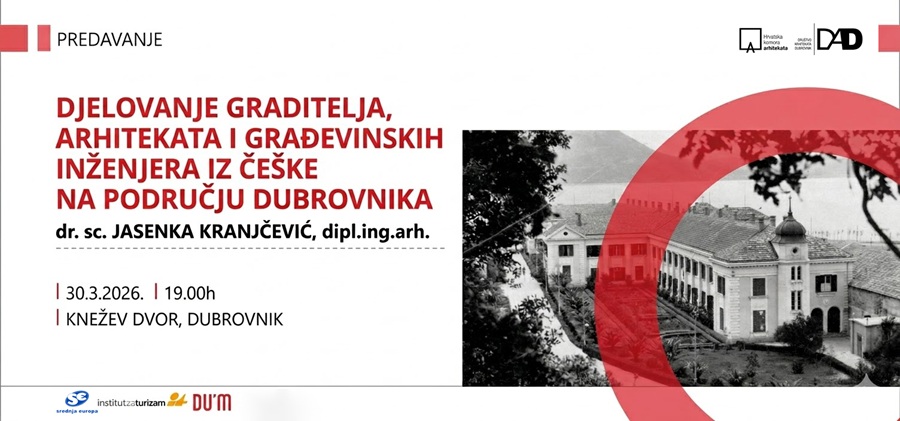 Hrvatska komora arhitekata – Područni odbor Dubrovnik, Društvo arhitekata Dubrovnik i Dubrovački muzeji pozivaju Vas na predavanje izv. prof. dr. sc. Jasenke Kranjčević s Instituta za turizam: “DJELOVANJE GRADITELJA, ARHITEKATA I GRAĐEVINSKIH INŽENJERA IZ ČEŠKE NA PODRUČJA DUBROVNIKA”.