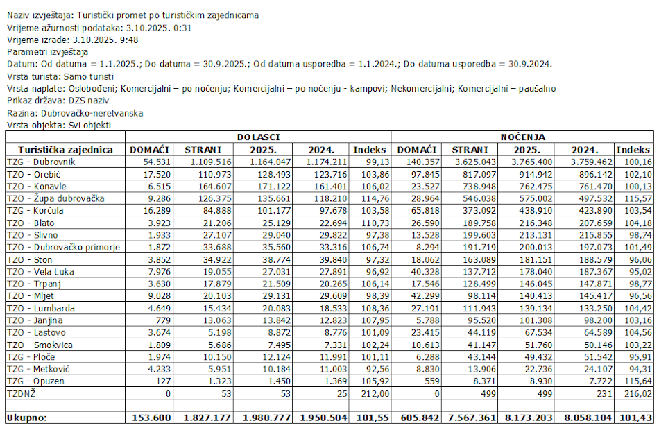 Prema podacima sustava eVisitor, tijekom rujna 2025. godine na području Dubrovačko-neretvanske županije ostvareno je 302.600 dolazaka i 1.212.059 noćenja, što predstavlja povećanje dolazaka za 2 %, a noćenja za 1 % u usporedbi s rujnom 2024. godine.