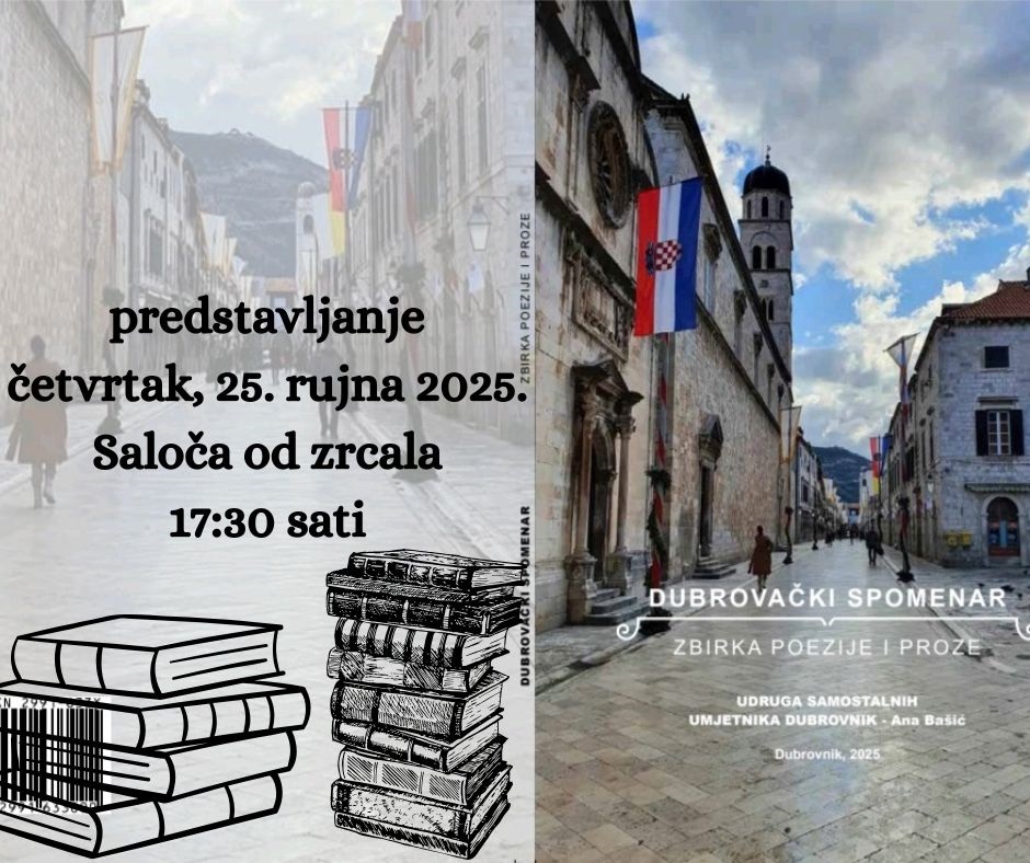 Udruga samostalnih umjetnika Dubrovnik (USUD) održat će predstavljanje ovogodišnjeg Dubrovačkog spomenara u Saloči od zrcala Narodne knjižnice Grad, u četvrtak, 25. rujna 2025. s početkom u 17:30 sati.