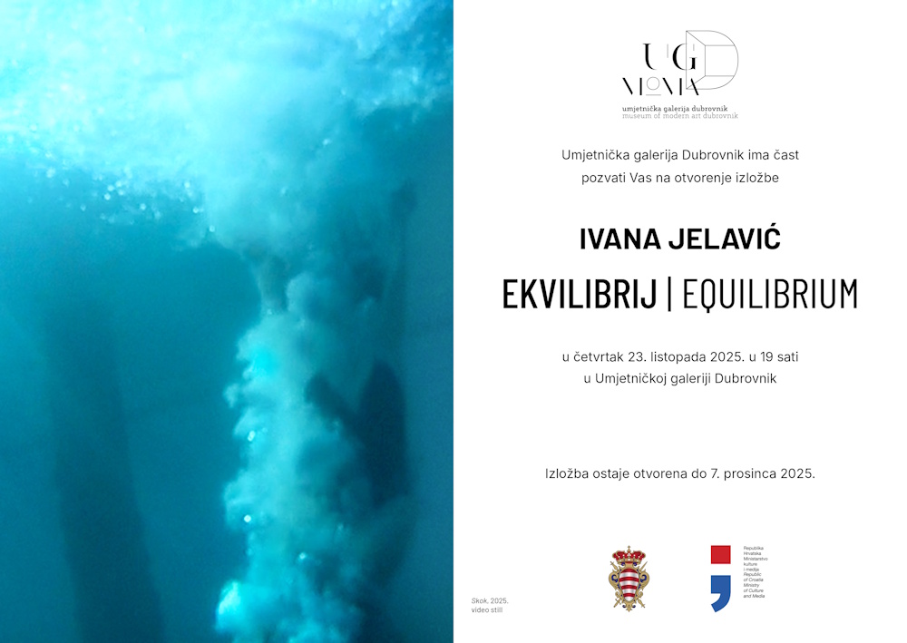 Izložba multimedijalne suvremene umjetnice Ivane Jelavić pod nazivom „Ekvilibrij” bit će otvorena u Umjetničkoj galeriji Dubrovnik u četvrtak, 23. listopada u 19 sati.